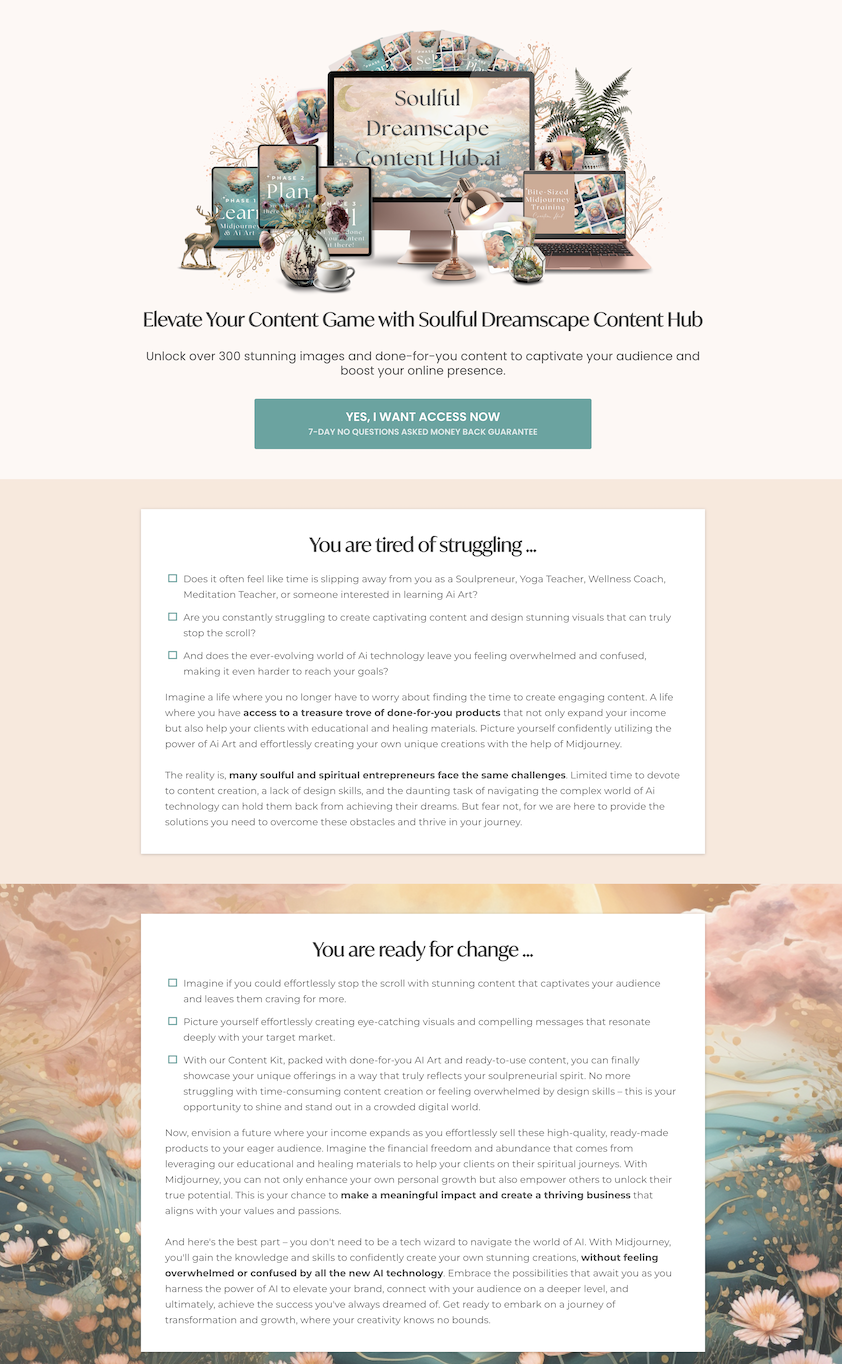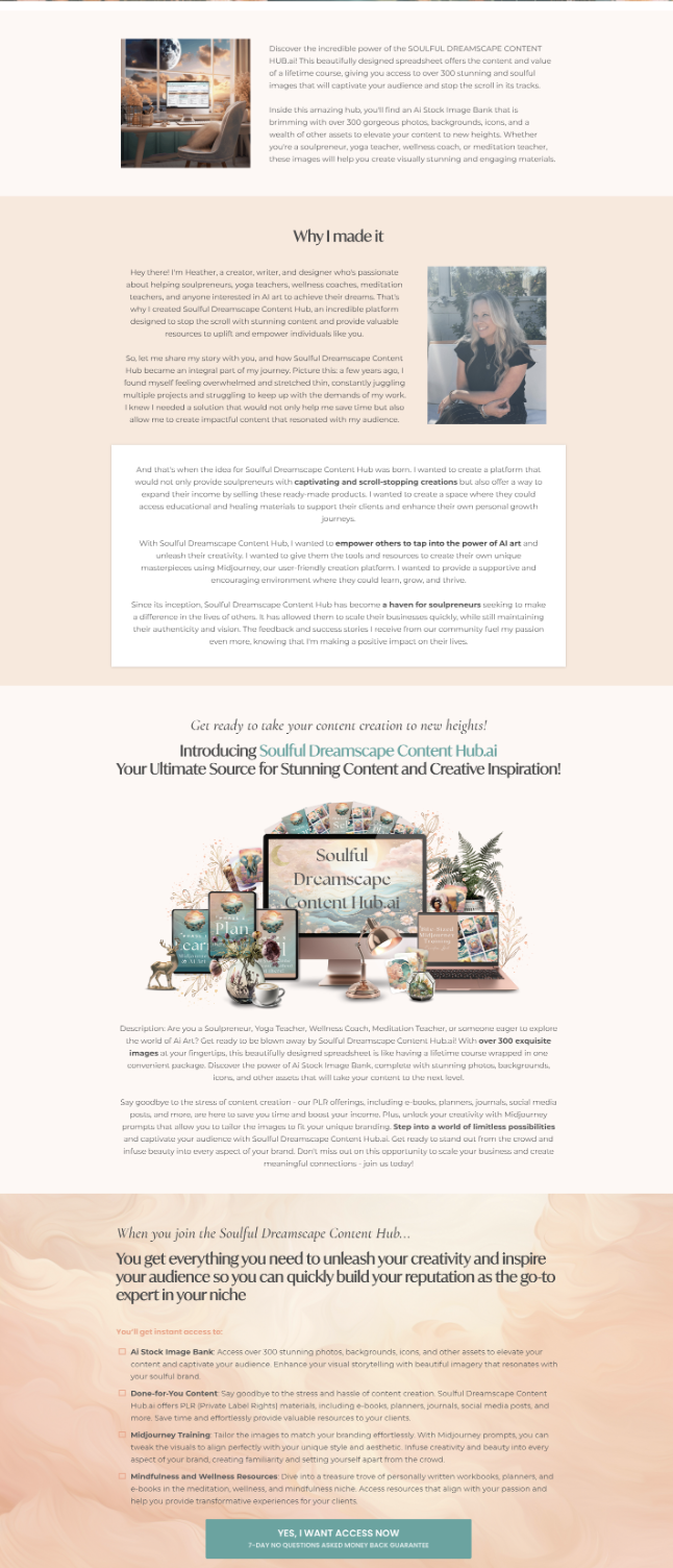 the "Soulful Dreamscape Content Hub" – a comprehensive, purpose-driven digital funnel meticulously crafted from ideation to execution. From the captivating freebie to the intricately designed long-form sales page, and the seamless checkout experience to the enticing upsell, every element is a result of my creative vision and design expertise.