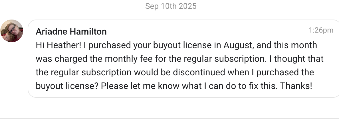We'll cancel your $49/month membership when we see your Buyout purchase come through. You won't be double-charged.